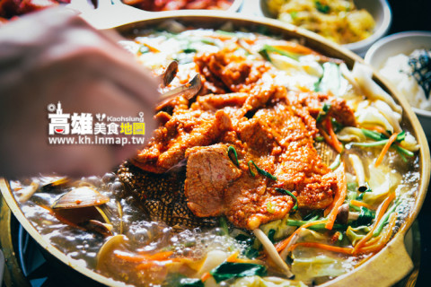 ▼湯品。海鮮豆腐湯,湯底非常用心,加入了大量海鮮熬煮,其中就有三點蟹、白蝦、蝦米、魚乾、昆布等,再熬入辣粉、辣椒,輕喝一口湯,就能品嚐出濃郁鮮味。海鮮豆腐湯用料含軟豆腐外,還有魚板、杏鮑姑、洋蔥、空心菜、蛤蠣等。