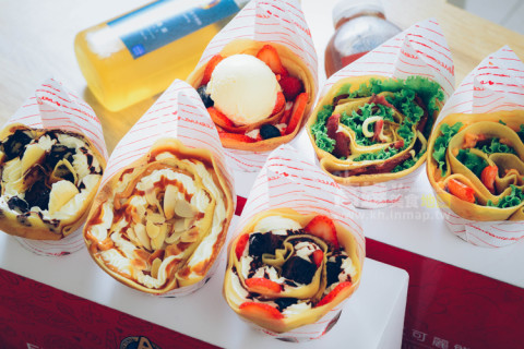 內餡填滿甜點、奶油、巧克力的軟式可麗餅,原本是來自法國人傳統餐桌上的甜點「法式可麗餅」,做成豐盛營養的鹹餅或酸甜冰心的甜餅午茶,讓法國女人優雅的用刀叉小口品嚐。而今這一家做成手持立體小捧花的甜筒式可麗餅,則是來自日本人的創意設計,讓女孩們邊手邊吃,這股散步甜點也已風靡好多年了。