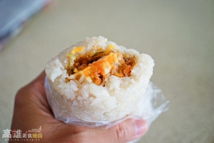 裡頭的配料有鹹香好吃的鹹蛋黃、菜脯、肉鬆、酸菜等,還有飯糰裡不可或缺的酥脆油條。
