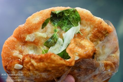 綜合口味的蔥肉蛋餅是放入了除了韭菜以外的所有蔬菜,也就是說有九層塔、高麗菜以及酸菜。