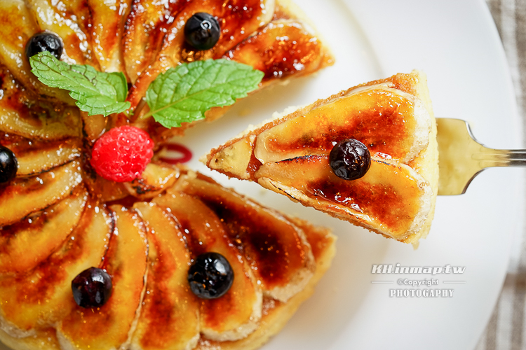 ▼初步成型出爐,在表層塗上一層楓糖漿,再將香蕉切成均勻片狀,螺旋式地覆蓋在上層,此時宛如雪花紛飛般撒上二砂糖,以火槍噴烤炙燒,只見砂糖溶解成為金黃色表皮糖霜,最後擺上鮮豔莓果點綴,讓莓果的滋酸、香蕉的甜美在口中完美融合。
