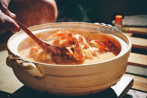 海味鮮明也來自於「關山米」及「昆布湯」,首先得先用昆布及備長碳浸泡水與生米,經六小時的靜置後,取出昆布及備長碳,開始以炭火熬煮生米,大概也需熬滾一小時,待生米煮滾成半透半熟時,開始下主角們;這裏的「黃金蟹粥」基本一定會有1隻季節限定大螃蟹、10隻黃金蟹外加10來隻牡丹蝦或胭脂甜蝦。
