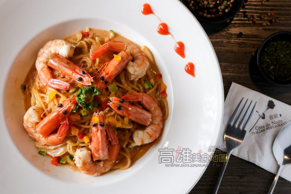 ▼夜坡裕誠店-人氣招牌【辣味鮮蝦奶油義大利麵】