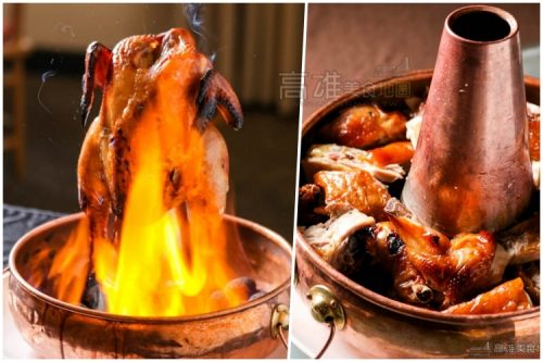 法國育種的薩索雞(SASSO)又稱為「紅標土雞」,血統優良又加上嚴格控管的生長環境、飼料成分和足夠的生長期,養成皮薄油少、肉質鮮嫩、紮實多汁。而爐烤方式是最能夠完美呈現出薩索雞的口感風味,先使用八角、丁香、桂皮等中藥材浸泡入味後,再淋上醋水風乾,接著以掛爐方式爐烤四十分鐘。出爐之後就是眾所矚目的桌邊上菜秀了。主廚先將浸泡當歸等中藥材的高粱酒淋上鍋底的麥飯石,然後點火瞬間香氣揮發,酒香中藥香充滿空間,燃燒後整個吸附於烤雞上。