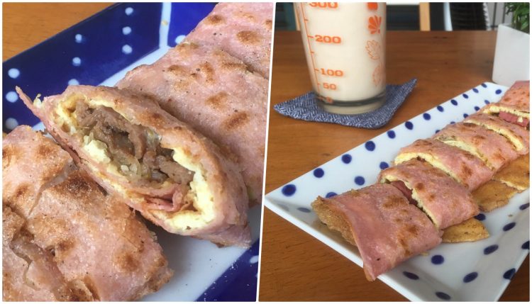 這間早餐店的蛋餅有別於一般早餐店的口味,泡菜燒肉、雪裡紅、酸菜燒肉之外,竟然還有燒烤牛肉塊夾蛋餅!