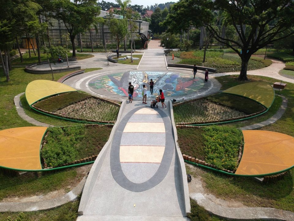 曾局長說,蝴蝶園館內及館外公園共占地面積8,529平方公尺,在挑高4.6公尺的賞蝶空橋上,來訪的遊客可以俯瞰蝴蝶飛舞,許多小朋友會在空橋上寫生,空橋兩側垂吊的綠盆植物花朵盛開,未來會往下生長成為植物瀑布,除了為立體空間增加豐富的視覺感受,也為蝶類提供更多的蜜源雨遮蔽空間。館外3D地景彩繪及大理石毛毛蟲模型更是打卡熱點,旁邊的手作教室有許多特色文創商品,喜歡著色的朋友還可以索取免費的蝴蝶園著色地圖,彩繪屬於自己的蝴蝶園!