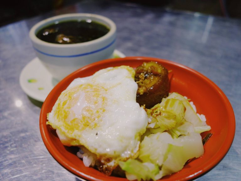 腳庫飯除了一塊腿庫肉外,旁邊還會附上季節蔬菜,再淋上肉燥醬汁,份量不算多,建議再加點湯品比較有飽足感。單點荷包蛋可另外裝盤或直接放在飯上,半熟蛋黃需另備註。