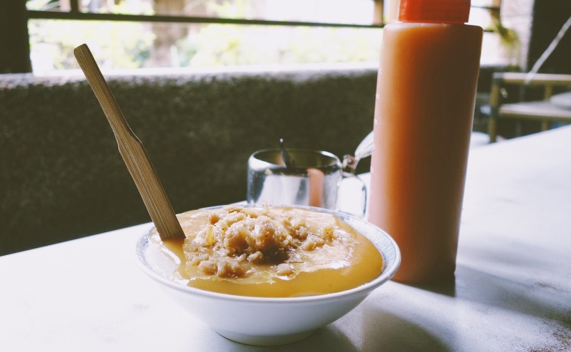 碗粿口感軟中帶Q,入口一抿即化,口感非常水嫩,淡淡米香的粿配上肉餡、鹹蛋黃、香菇整個碗粿口味鮮甜可口,焦糖色醬料有使用米漿製作呈現自然濃稠狀,口味帶點鹹甜味,搭配碗粿一起入口增加滑潤度更方便食用,不時吃到手工炒菜脯脆脆口感增加多層次風味。