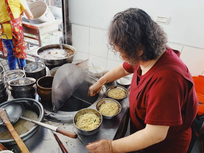 目前麵店由老闆娘跟兒子一起經營,主要是由老闆娘煮麵,老闆兒子負責切菜、送餐跟結帳。