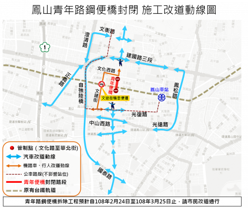 配合鐵路地下化工程,鳳山青年路鋼便橋自108年2月24日凌晨0時起封閉30日,進行便橋拆除及平面道路鋪設工程,請市民提前改道並留意改道資訊。