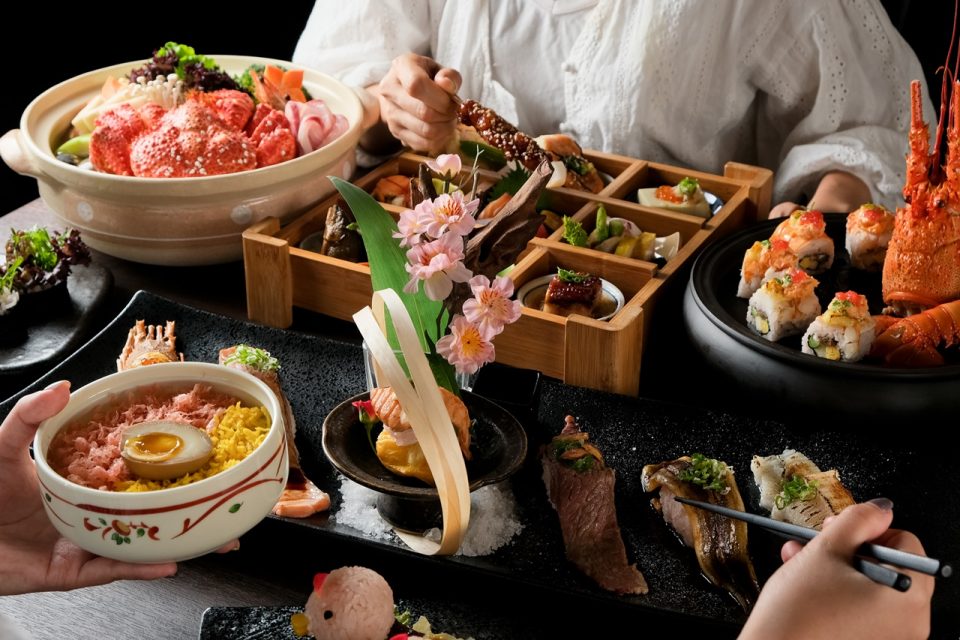 香魚柚子燒、扇貝水果醋沙拉、天婦羅炸蝦、韓式豬肉串、綜合生魚片、炙燒明太子軟法、鰻魚新丈、魚板蛋黃醬、馬鈴薯泥花枝捲、櫻桃鴨捲蘆筍、松葉蟹肉豆腐,等等,已經超過9樣啦?原來有些一格不只一菜,看起來很豐富也真的很好吃。我還沒說它還有附鮭魚蕎麥麵和蕈菇飯吧?保證讓人飽到翻過去。