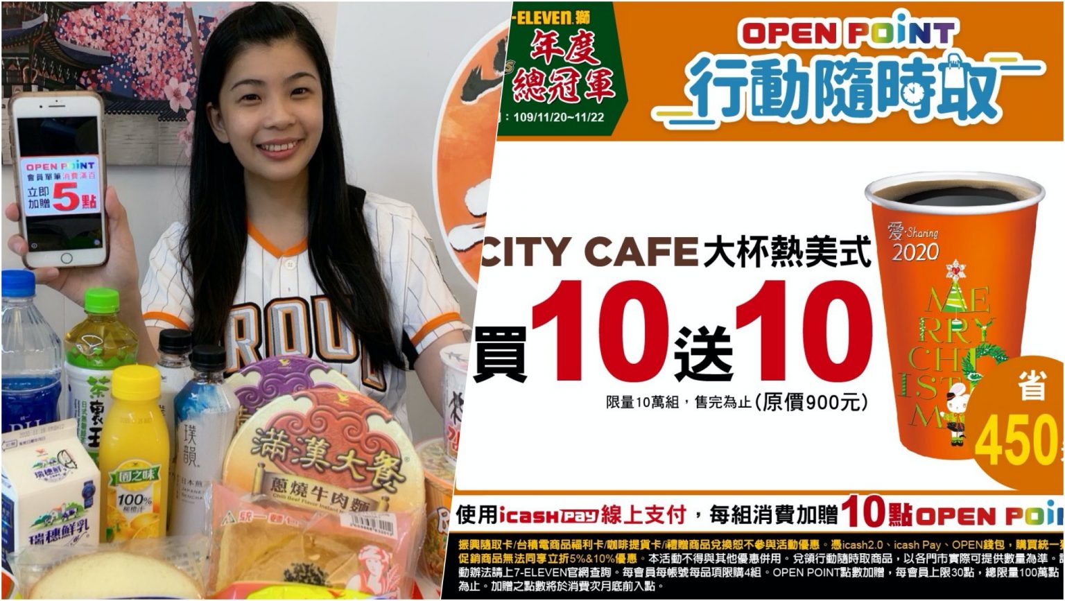 爲慶祝統一7-ELEVEn獅隊勇奪2020年中華職棒總冠軍,7-ELEVEN自11月20日起連續三天結合線上線下虛實整合擴大慶祝活動,為歡慶拿下隊史上第10座總冠軍,OPEN POINT APP的「行動隨時取」推出CITY CAFE大杯熱美式咖啡、CITY TEA熱四季春青茶、統一巷口乾麵(麻醬風味)四合一袋、HIS CAFE純黑咖啡/醇熱咖啡以及UNI FIT氣泡運動飲..等多項商品買10送10的超值優惠。不僅如此,活動期間購買行動隨時取商品,使用icash pay線上支付,每組消費加贈OPEN POINT點數10點,如此好康優惠,還不買起來!