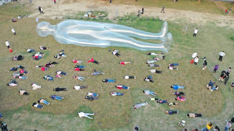 2月6日年假的最後一天,知名旅遊作家謝哲青到衛武營欣賞燈會,恰好遇到空氣人快閃活動,謝哲青也開心的與大家一同躺在草地上。這個快閃活動,會一直持續到2月28日,燈會期間每天下午5:30,歡迎大家一起到衛武營童趣光樂園草地,跟空氣人「躺平」在草皮上仰望天空,也從另個角度欣賞這次的台灣燈會。