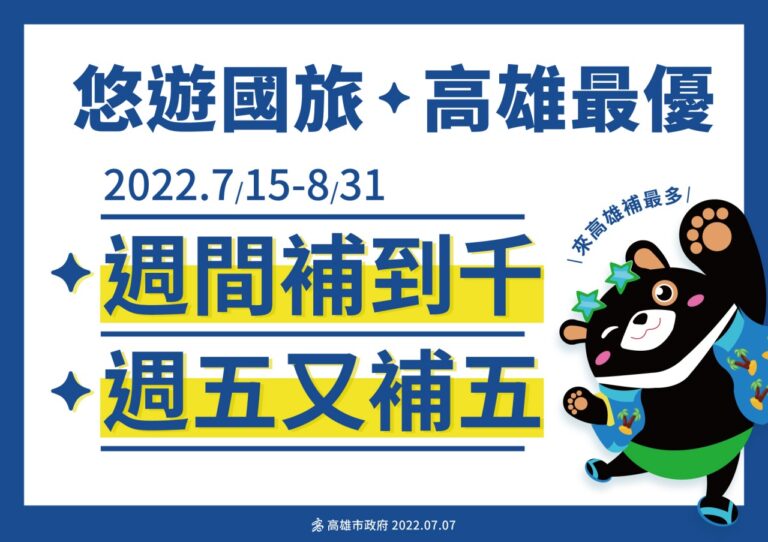 高雄市觀光局長周玲妏表示,市府搭配中央悠遊國旅政策,自7月15日至8月31日暑假期間,特別推出「週間補到千、週五又補五」住房加碼,在週日至週四,入住本市「安心旅宿」、「動物友善空間認證」、「無障礙設施」等合法旅宿,除享有中央補助額度外,市府每房再加碼補助200元,讓民眾最高可獲1500元補助;另外針對中央不補助的週五,高雄更領先全台,獨家大方再補助週五當晚500元,讓民眾來高雄開心歡渡週未夜,只要在活動期間週五入住,就可享此優惠,上述優惠額度用完為止,先住先贏。