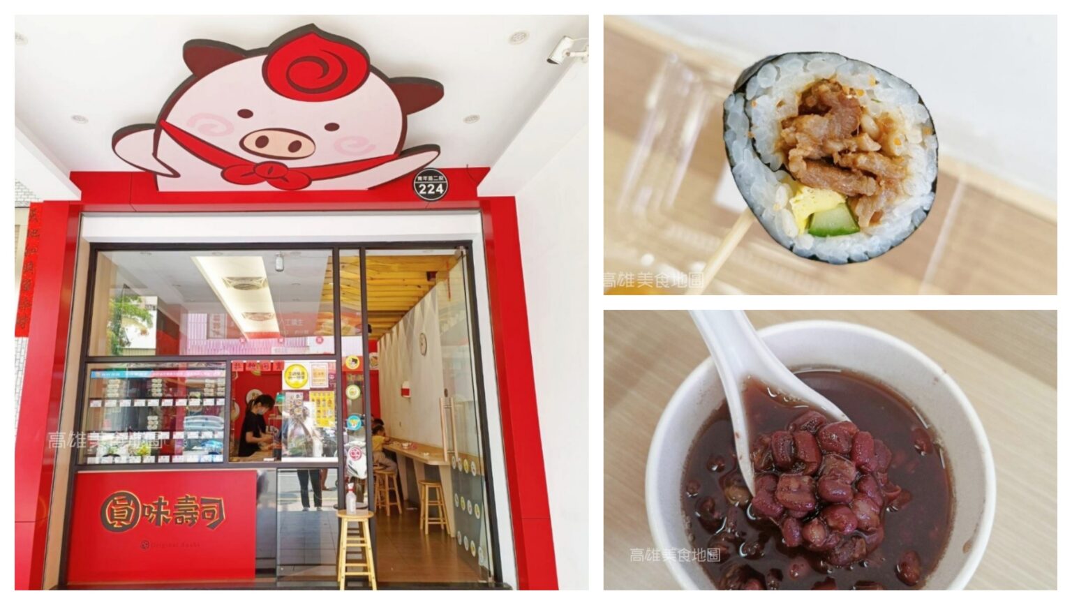 小小的騎樓下,外牆有一個大大的壽司圖案布條,招牌不大,但是鮮紅色招牌十分搶眼,走進騎樓的天花板上還有一隻粉紅豬。