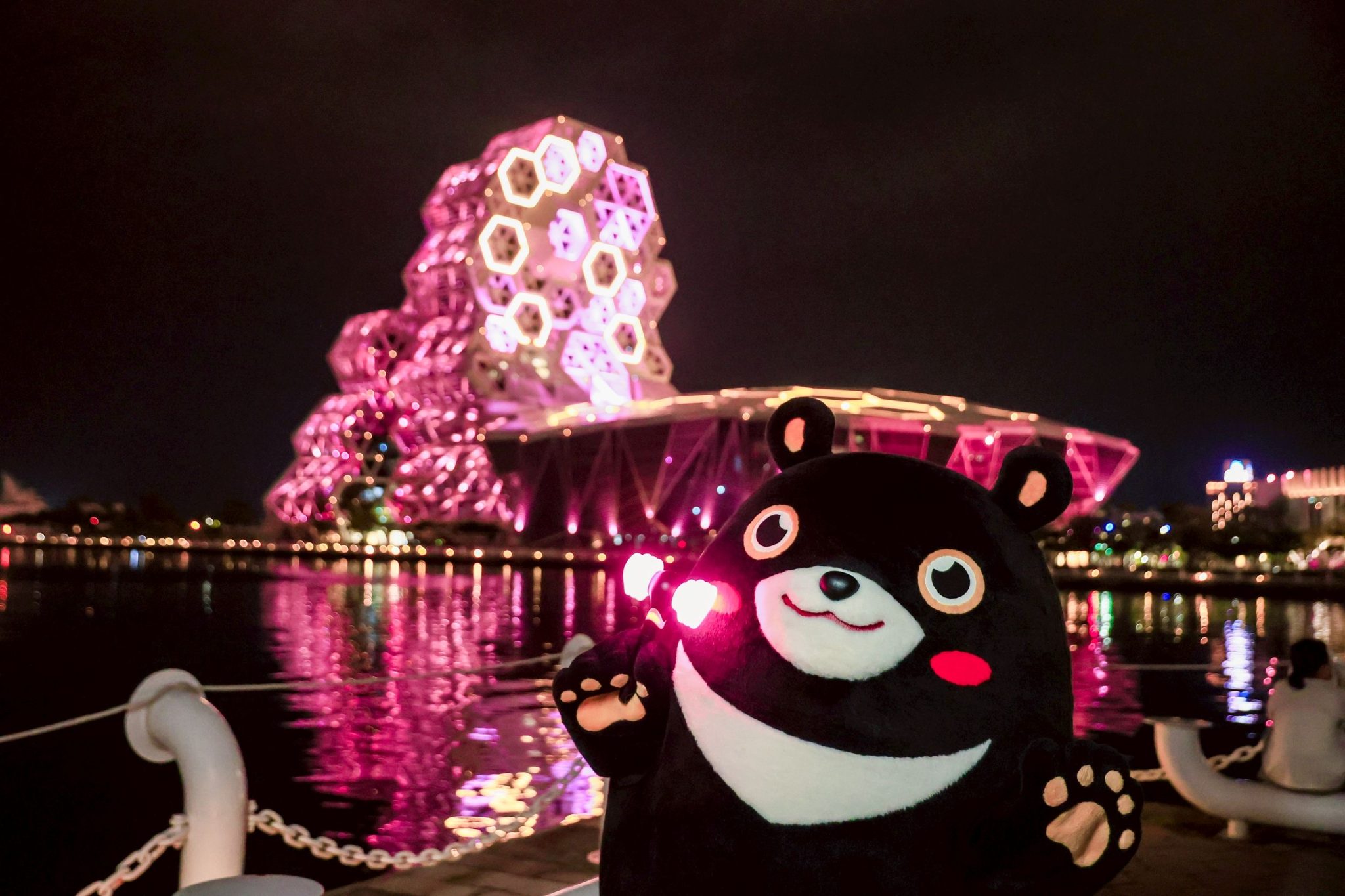 ▲響應粉紅熱潮,城市吉祥物高雄熊換裝熱情迎接各地歌迷粉絲。