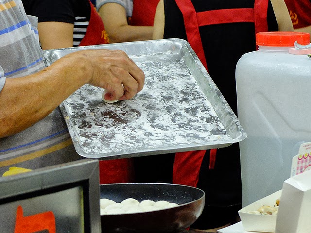 店員(老闆??)正快速的煎著新的一批煎包,不過看起來好像是用一般的平底鍋在煎…